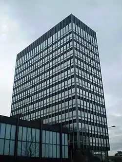 New Century House was designed by G. S. Hay and Gordon Tait and constructed by John Laing & Son for the Co-operative Insurance Society in 1962.[2] The attached New Century Hall has a capacity of 1,000 people. New Century House and Hall were listed in 1995 as Grade II as a good example of a high-quality post-war office building. It is considered one of the finest modernist towers in the United Kingdom alongside the sister building CIS Tower (1962, Grade II), the Arts Tower in Sheffield (Grade II*) and Euston Tower (1970) in London. It is described in its listing as "A design of discipline and consistency which forms part of a group with the Co-operative Insurance Society".[1]