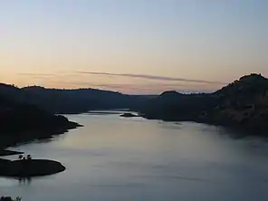 Don Pedro Reservoir has a capacity of 2,030,000 acre-feet (2.50 km3), of which 340,000 acre-feet (0.42 km3) is reserved for flood control and 1,381,000 acre-feet (1.703 km3) is available for irrigation, municipal water supply, and hydroelectric generation. The flood control reservation is one of the smallest among major California reservoirs because it allows for more water to be stored for power generation, but this has often resulted in inadequate flood protection such as in 1997 when the dam released more than 50,000 cubic feet per second (1,400 m3/s) – almost six times the capacity of downstream levees.[22] The bottom 309,000 acre-feet (0.381 km3) is considered dead storage, or the lowest point at which water can be released to generate power.[1] At an elevation of 804 feet (245 m) (service spillway crest), the reservoir is 25 miles (40 km) long, and has an area of 12,960 acres (5,240 ha)[2] with 160 miles (260 km) of shoreline.[1] The maximum elevation of the reservoir at the crest of the emergency spillway is 830 feet (250 m) above sea level.[22]