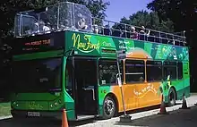 As part of the new marketing, the vehicles were painted in a new green livery with ponies on the side,[6] essentially a green version of Southern Vectis' Island Breezers livery. The Tour's website was launched, and 60,000 leaflets were distributed to over 300 places.[7] An official guide was also launched, given to passengers as they boarded the tour.[7] The buses no longer towed trailers, carrying bicycles on the lower deck instead.[8]