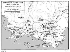 The landings in the Munda area were the most important of the four; the initial phase of this part of the operation was the capture of Rendova, commanded by Admiral Turner. A total of 6,000 soldiers, sailors and marines of the US Army's 172nd Infantry Regiment, the 9th Marine Defense Battalion, and the Navy's 24th NCB landed at Rendova Harbor early on 30 June while Companies A and B of the 169th Infantry Regiment along with the New Zealand-trained and led commando unit of 130 South Pacific islanders took three strategic islets in the Blanche Channel opposite Munda.[21][22] Rendova, Wickham Anchorage and Viru Harbor were developed into staging areas for the main event, the siege of Munda, while Segi Point was developed into an airfield.[23] The small Japanese garrison on Rendova was quickly overwhelmed but the island was subjected to heavy attack by Japanese aircraft over the following days. The Marines on Rendova quickly built artillery emplacements from which they could shell Munda airfield and support the operations during July and August to capture of Munda airfield.[24][25]