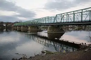 The New Hope–Lambertville Bridge, officially called the New Hope–Lambertville Toll Supported Bridge, is a six-span, 1,053-foot (321 m)-long bridge spanning the Delaware River that connects the city of Lambertville in Hunterdon County, New Jersey with the borough of New Hope in Bucks County, Pennsylvania, United States.[2] The current steel truss bridge was constructed in 1904 at a cost of $63,818.81.[3] It is owned and maintained as a toll-free bridge by the Delaware River Joint Toll Bridge Commission.