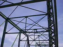 The New Hope–Lambertville Bridge is a six-span, pin-connected Pratt through truss containing 962 tons of steel.[4] Its total length is either 1,045 or 1,053 feet (321 m), depending on the source. Each span measures 171 feet (52 m).[5] The bridge supports a cantilevered walkway on its southern side for pedestrians.