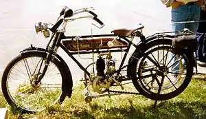 New Hudson Cycle Co. launched their motorised bicycles at the annual Stanley Show in November 1902.[5] Two motorcycles were exhibited, one with a De Dion-Bouton engine and another with a Minerva engine. Production seems short-lived as they went back to pure bicycle manufacture. Then around 1910 they started producing motorcycles again fitted with JAP engines, and in 1911 they attended the Olympia Motor Cycle show exhibiting their 3.5HP Colonial model (85mm bore, 88mm stroke), which had a single cylinder side valve engine of their own making, but was optionally available with a JAP engine, and they displayed a 2.5 hp model (70mm bore, 76mm stroke) which was fitted with a JAP engine.[6] By the November 1913 show the range had been expanded to include a 211cc 2-stroke (62mm bore, 70mm stroke), as well as a military single cylinder model of 499cc, and their "Master Model Big Six", which was a motorcycle powered by a 50 degree V-twin of 770cc (76mm bore, 85mm stroke). The show report notes that "New Hudson Cycle Co were one of the first firms to fit, as standard, three-speed gears to motorcycles".[7]