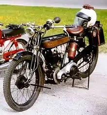 After WW1 they resumed motorcycle manufacture, but only with the single cylinder 2-stroke which they had originally introduced in 1914.[8] Their adverts claimed it was "constructed throughout, including engine and gearbox, in the New Hudson works". A racing version of the 2-stroke was introduced for 1921, capable of 50 mph.[9] At the 1921 Olympia show New Hudson unveiled their first 4-stroke since the war, a 4.5HP single cylinder sidecar outfit. The side-valve engine had a bore of 86mm and stroke of 100mm giving 594cc. The following year new side-valve 346cc and 498cc solo motorcycles were added to the range.[10]