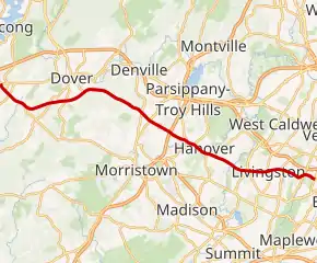 Route 10 begins at US 46 in the Ledgewood section of Roxbury Township, Morris County at the former Ledgewood Circle, heading to the southeast on a four-lane divided highway with some jughandles.[1] The road passes by The Shops at Ledgewood Commons, the Roxbury Mall, and many other businesses, also crossing the Dover and Rockaway River Railroad's High Bridge Branch.[2] The route crosses the Dover and Rockaway River Railroad's Chester Branch before it enters Randolph Township, where the road becomes less commercial in nature and passes Randolph Lake, reaching an interchange with CR 617. Past this interchange, Route 10 crosses over forested Mine Hill.[1][2] The route crosses CR 513 and passes north of the County College of Morris past that intersection, with suburban development becoming more frequent again. Route 10 widens to six lanes and then runs through the southwestern corner of Denville before heading into the Mt. Tabor section of Parsippany-Troy Hills.[1]