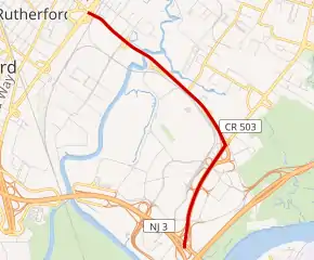 Route 120 begins at an interchange with Route 3 in East Rutherford, heading north-northeast on a six-lane freeway with a 50 mph (80 km/h) speed limit through the Meadowlands Sports Complex.[1] Here, MetLife Stadium, home field of the New York Giants and New York Jets of the National Football League, and the Meadowlands station at the terminus of NJ Transit's Meadowlands Rail Line is on the west side of the road, while the closed Meadowlands Arena and the American Dream shopping and entertainment complex are on the east side of the road.[2] There is an exit for an access road to the complex. The freeway comes to an end at an interchange where the road continues northeast into Moonachie as County Route 503 (Washington Avenue), while Route 120 exits onto the Paterson Plank Road and heads northwest as a four-lane divided surface road posted at 40 mph (64 km/h) along the border of Carlstadt to the northeast and East Rutherford to the southwest.