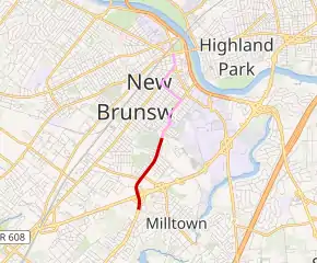 Prior to the truncation of Route 171 to North Brunswick by 2019, the Route 171 was carried along the county and city-maintained Georges Road, Commercial Avenue (renamed to Paul Robeson Boulevard in 2019[9]), Suydam Street, Livingston Avenue, and George Street (the final street concurrent with CR 527) before ending at Albany Street (Route 27). With a small extension to the US 130 ramp to US 1 north at its southern end, the total length of the original route was 3.10 miles (4.99 km).[10] No signage for Route 171 appeared along the New Brunswick segments of the route though one sign for it appeared at its intersection with Route 27 in July 2016.[11][12]