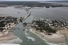 On February 1, 2013, Route 35 through Mantoloking was fully reopened after being closed since October 29, 2012 after Hurricane Sandy hit the area. The night of the storm at the intersection where the Mantoloking Bridge and Route 35 meet, a new inlet was formed by the raging storm waters. This effectively cut off the island from the mainland.[24]