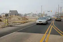 Past the Route 37 interchange, Route 35 continues north along Barnegat Bay, curving eastward and crossing into Toms River Township, where the route splits into a block-wide one-way pair with two lanes and a bike lane in each direction that heads north through residential and commercial Ortley Beach. After crossing into Lavallette a mile later, the northbound direction of Route 35 becomes Grand Central Avenue and the southbound direction of Route 35 becomes Anna O. Hawkins Boulevard.[1][3] The route then crosses back into Toms River Township, passing through Dover Beaches North. When Route 35 enters Brick Township, the northbound direction becomes Ocean Avenue and the one-way pair between the opposing directions of Route 35 narrows as it passes oceanfront residences.[2] Upon crossing into Mantoloking, Route 35 becomes a two-lane, undivided road and heads north along a narrow peninsula, intersecting the eastern terminus of County Route 528 (Herbert Street) less than a mile later.[1]