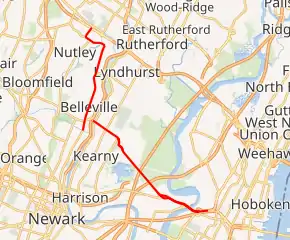After an intersection with Schuyler Avenue (which runs as Hudson County Route 507 to the south of Route 7 and Bergen County Route 130 to the north of Route 7), the road turns NNW, narrowing again to two lanes undivided. In this portion of the route, it had a concurrency with County Route 507 (both Bergen and Hudson counties). It keeps this configuration for about a half mile, as it still runs along the Kearny/North Arlington border. At that point, it meets the southern terminus of Route 17 (Ridge Road) and the northern terminus of County Route 697 (Kearny Avenue).[1][2]