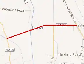 State Road 226 (NM 226) is a 2.600-mile-long (4.184 km), paved, two-lane state highway in Doña Ana County in the U.S. state of New Mexico. NM 226's western terminus is north of Chamberino at the road's junction with NM 28. The road's eastern terminus is near Berino at the road's junction with NM 478. The road continues as East Berino Road past the junction with NM 478. NM 226 is also known as West Berino Road.