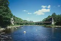 The New Portland Wire Bridge is a historic suspension bridge in New Portland, Maine. The bridge carries Wire Bridge Road across the Carrabassett River a short way north of the village center. Built in the mid-19th century, it is one of four 19th-century suspension bridges in the state. It is one lane wide, and has a weight limit of 3 tons. The bridge was listed on the National Register of Historic Places in 1970 and was designated as a Maine Historic Civil Engineering Landmark by the American Society of Civil Engineers in 1990.[1][2]