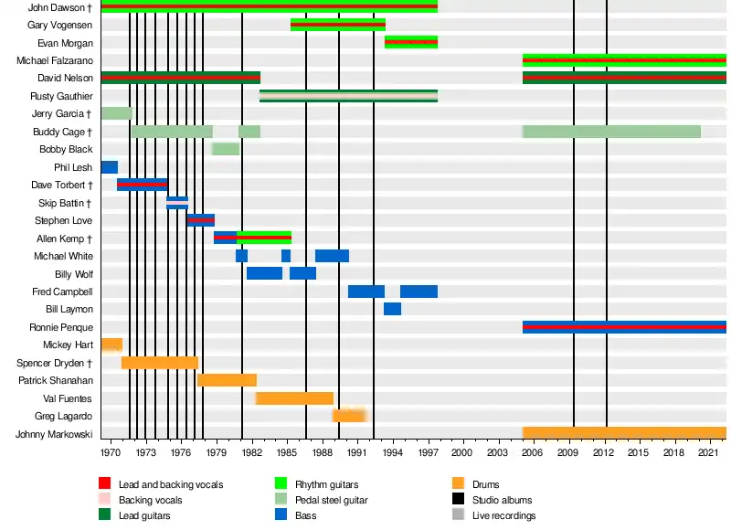 | Past members | John Dawson Jerry Garcia Mickey Hart Bob Matthews Robert Hunter Phil Lesh Dave Torbert Spencer Dryden Buddy Cage Skip Battin Stephen A. Love Patrick Shanahan Allen Kemp Bobby Black Pete Grant Michael White Billy Wolf Val Fuentes Rusty Gauthier Greg Lagardo Gary Vogensen Fred Campbell Evan Morgan Bill Laymon |