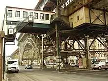 About 40% of the subway system runs on surface or elevated tracks, including steel or cast-iron elevated structures, concrete viaducts, embankments, open cuts and surface routes.[80] As of 2019, there are 168 miles (270 km) of elevated tracks.[81] All of these construction methods are completely grade-separated from road and pedestrian crossings, and most crossings of two subway tracks are grade-separated with flying junctions. The sole exceptions of at-grade junctions of two lines in regular service are the 142nd Street[82] and Myrtle Avenue junctions, whose tracks intersect at the same level, as well as the same-direction pairs of tracks on the IRT Eastern Parkway Line at Rogers Junction.[83][84]