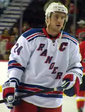 In March 2000, Smith was fired along with head coach John Muckler, and that summer, James Dolan hired Glen Sather to replace him.[26] By the end of the 2000–01 season, the Rangers had landed a significant amount of star power. Messier had returned to New York, Theoren Fleury joined the Rangers after spending most of his career with the Calgary Flames[27] and Eric Lindros was traded to the Rangers by the Flyers.[28] The Rangers also acquired Pavel Bure late in the 2001–02 season from the Florida Panthers.[29] It was also the rookie season of goalie Dan Blackburn, who made the NHL All-Rookie Team even as the Rangers fell back to last place in the Conference,[30] and finished out of the playoffs. Later years saw other stars such as Alexei Kovalev, Jaromir Jagr, Martin Rucinsky and Bobby Holik added, but in 2002–03 and 2003–04, the team again missed the playoffs. Blackburn started strongly in 2002–03, but burned out after 17 games. He missed 2003–04 due to mononucleosis and a damaged nerve in his left shoulder. Blackburn could not rehabilitate the damaged nerve, and was forced to retire at the age of 22.[31] Towards the end of the 2003–04 season, general manager Glen Sather finally gave in to a rebuilding process by trading away Brian Leetch, Alexei Kovalev, and eight others for numerous prospects and draft picks. With the retirements of Pavel Bure and Mark Messier, as well as Eric Lindros signing with the Toronto Maple Leafs, the post-lockout Rangers, under new head coach Tom Renney, moved away from high-priced veterans towards a group of talented young players, such as Petr Prucha, Dominic Moore and Blair Betts.