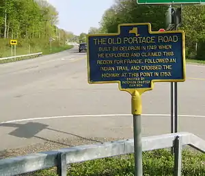 Another French expedition in 1753 converted the portage road into a military road. The road was still in evidence in 1802 when settlers first moved into the area. They called it the "Old French Road" and the Holland Land Company used it as the western end of Chautauqua Road, the first road cut through the Southern Tier of Western New York.[8] Remnants of the portage road remain to this day: most of NY 394 between the two waterbodies is named Portage Street, and a loop road off NY 394 south of the village of Westfield is called Old Portage Road.