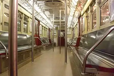 Interior of IRT R12 subway car with rattan seat cushions
