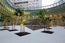 A permanent campus is on Saadiyat Island within a cultural district for the city that houses Louvre Abu Dhabi and is also planned to house Guggenheim Abu Dhabi museum.[22] Architect Rafael Viñoly was named master planner for the campus, designing it to combine elements of NYU's Greenwich Village environment and traditional Islamic villages.[23] The pedestrian campus consists of state-of-the-art classrooms, library, and information technology facilities; laboratories; academic buildings; student dormitories; faculty and residential housing; and athletic and performance facilities. The campus covers nearly 40 acres and also offers a number of public spaces, including theater and performance halls, an art gallery, conference center, and various retail offerings. The construction costs of the NYUAD Saadiyat Campus were entirely funded by the Abu Dhabi government, as will be the operating costs and any future expansions.[24]
