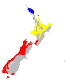 Lesser short-tailed bats have been found in a few populations dispersed around the country. There are populations on both of the main islands, as well as various surrounding islands. There are a few key populations currently known. There is one on Little Barrier Island (Hauturu), one near the top of the North Island, seven in the central area of the North Island, and one on the south-eastern side of the North Island. There are at least two on the mainland of the South Island; and one on Codfish island further south.[10] The bats can live at a wide range of altitudes, from sea level to high up among the forest-covered mountains.[6] M. tuberculata prefer to live in untouched forest settings. However, they have been reported in various habitats, such as farmland and shrubland.[11]
