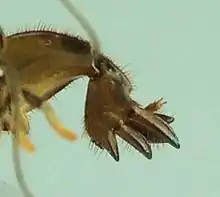Triamescaptor aotea is 20–30 millimetres (0.79–1.18 in) long, and medium to dark brown in colour, with distinct protruding antennae and long rear processes (or cerci). Its rear cerci are sensory, and in its tunnel it is able to move backwards as easily as forwards. The first segment of its thorax is extended, rounded, and armoured. Its front legs are heavily modified for digging, flattened and shovel-like, with just three claw-like processes or dactyls on its tibia (Gryllotalpa has four),[7] two movable and one fixed.[1]