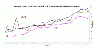 Certain scholarly funding agencies make a distinction between investigators and new investigators. New investigators would be evaluated in a different way when competing for funding with more seasoned researchers, or they would be able to access funding resources specific to them. The rationale behind is to avoid the current trend that for certain grants the average age of the researchers receiving it for the first time keeps increasing over the years (See graph).[1]