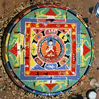 Building elements like the carved Newar window, roof struts on temples and the tympanum of temples and shrine houses exhibit traditional creativity. From as early as the seventh century, visitors have noted the skill of Newar artists and craftsmen who left their influence on the art of Tibet and China.[77] Newars introduced the lost-wax technique into Bhutan and they were commissioned to paint murals on the walls of monasteries there.[78][79] Sandpainting of mandala made during festivals and death rituals is another specialty of Newar art.