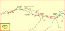 The main line at the eastern end was to cross the Tyne at Scotswood, then follow the north bank of the river closely and at a low level, to a termination at the Close, in Newcastle. There was to be a branch from Elswick Dean to a terminal at Thornton Street.[6] Close, a mononymous road, still exists on the bank of the Tyne between Queen Elizabeth Bridge and High Level Bridge. Thornton Street street also still exists: a northward extension of Waterloo Street northwest of Central station; the location is at a high level and would have required a steep gradient (of about 1 in 50), worked by stationary engine and rope haulage.