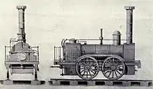 When the line was being planned in 1825, it was decided to arrange it as a toll road, on which any independent carrier might run his vehicles on payment of the toll; and horse traction was intended. By May 1834 this was beginning to look antiquated as other railways, in particular the Stockton & Darlington Railway, had successfully taken the haulage of trains to itself and introduced steam locomotives. On 13 June, therefore, the Board of the N&CR decided to adopt the same arrangement and subsequently placed orders for two locomotives, of which one was to be built by R & W Hawthorn Ltd. and the other by Robert Stephenson & Co. The first of these, an 0-4-0 locomotive named Comet was delivered in 1835, closely followed by 0-6-0 Rapid.[13] The Company circularised landowners as this was specifically forbidden in the Company's Act; the response was generally favourable or acquiescent, and the company undertook to use coke instead of coal to minimise any smoke nuisance.[1]