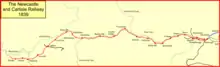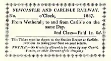 The single-track sections on the line in 1840 were from Stocksfield to Hexham, and from Rose Hill to Milton; on the double track sections the N&CR practised right-hand running. Most stations did not have elevated platforms.[2][22] The track was standard gauge, at first using fish-belly rails of 42 lbs per yard, although by 1837 heavier parallel rails at 47–50 lbs per yard were being installed. The rails were laid on stone blocks, and small coal, cinders and loam were used for ballast.[23] The stations were without platforms, the carriages being lower than those on other railways and provided with footboards. The station at Milton had a stable, the branch line to Brampton being worked by a horse and a "dandy" coach.[24][25]