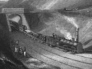 In 1805 William Thomas developed a scheme for a horse-operated plateway (in which the rails are L-shaped, with plain wagon wheels running on the flat part of the rail) between Newcastle and Hexham. This came to nothing, but collieries in the Newcastle area were increasingly turning to ideas of railways and locomotives, and when William Chapman returned to consider linking Newcastle upon Tyne and Carlisle in 1824, it was appropriate to consider a railway as a possible alternative to a canal. He planned to use his earlier canal route for a railway, substituting rope-worked inclined planes for the flights of locks, and found that a railway would be considerably cheaper than the equivalent canal: £252,000 against £888,000.[2] Horse traction was still incorporated into Chapman's railway plans.[1]