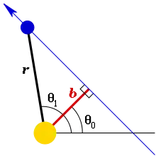 where θ0 is the angle at which the distance is minimized (Figure 6). The distance r begins at infinity (when θ1 – θ0 = −90°), and decreases gradually until θ1 – θ0 = 0°, when the distance reaches a minimum, then gradually increases again to infinity at θ1 – θ0 = 90°. The minimum distance b is the impact parameter, which is defined as the length of the perpendicular from the fixed center to the line of motion. The same radial motion is possible when an inverse-cube central force is added.