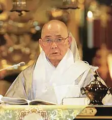 The current leader of the sect is the 68th High Priest, Nichinyo Shōnin (1935–). Nichiren Shōshū priests distinguish themselves from those of most other schools by wearing only white and grey vestment robes and a white surplice, as they believe Nichiren did.