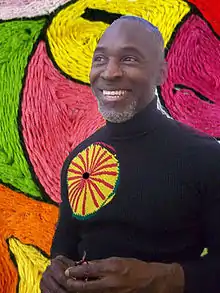 Nick Cave (born February 4, 1959, in Fulton, Missouri, United States) is an American fabric sculptor, dancer, and performance artist.[1] Cave's family was large in size and always supportive of his artistic interests. He claims his upbringing gave him an artistic attentiveness to found objects and assemblages. Cave started his artistic journey by manipulating fabrics from older sibling's hand-me-downs. After he graduated from Hickman High School in 1977, he enrolled in the Kansas City Art Institute where he finished a Bachelor of Fine Arts in 1982. He is best known for his Soundsuits – wearable fabric sculptures that are bright, whimsical, and other-worldly. He also trained as a dancer with Alvin Ailey.[2] His later sculptures focused on color theory, mixed media, and large-scale installations. He currently resides in Chicago, Illinois, and is director of the graduate fashion program at the School of the Art Institute of Chicago.[3] He still continues to work on Soundsuits as well as works completed as a sculptor, dancer, and performance artist. [4]