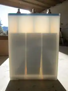 ![]() Nickel–iron batteries manufactured between 1972 and 1975 under the "Exide" brand originally developed in 1901 by Thomas Edison. | |