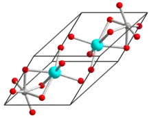 Nickel(II) titanate crystallizes at 600 °C[2] and is stable at room temperature and normal pressure in an ilmenite structure with rhombohedral R3 symmetry.[4] Nickel(II) titanate's rhombohedral structure has layers of Ni and Ti alternate along the rhombohedral axis with O layers between them. The XRD data supports nickel(II) titanate's ilmenite structure with its rhombohedral symmetry.[2] Other descriptions of nickel(II) titanite's Illemite structure consists of a pseudo close packed hexagonal array of O2− ions with two thirds occupied by an ordered hexagonal like cation.[5] The Average crystallites size for nickel(II) titanate was estimated at 42 nm with lattice constants of a = 5.032 Å, b = 5.032 Å, c = 4.753 Å.[5] The structure was established by using X-ray power intensities.[4]