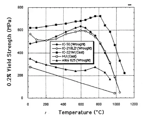 This alloy is extremely strong for its weight, five times stronger than common SAE 304 stainless steel. Unlike most alloys, IC-221M increases in strength from room temperature up to 800 °C.