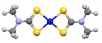 Nickel bis(dimethyldithiocarbamate) is the coordination complex on nickel and dimethyldithiocarbamate, with the formula Ni(S2CNMe2)2 (Me = methyl). It is the prototype for a large number of bis(dialkhyldithiocarbamate)s of nickel(II), which feature diverse organic substituents, all of which have similar structures. Nickel bis(dimethyldithiocarbamate) has been marketed as a fungicide and related complexes are used a stabilizers in polymers.[1]