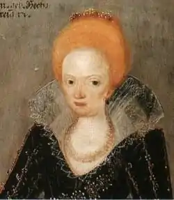 Stanca, who had been previously married to Postelnic Dumitru of Vâlcănești, was a relative of the Buzești boyars.[22] She was also mother of Michael's daughter, Florica, who may have been born to another woman.[23] Historians disagree on whether Florica was born ca. 1585[24] or much earlier.[25] She was promised in marriage to several European monarchs, but eventually wed boyar Preda "Floricoiu" of Cepturoaia.[26] Stanca's brother was Dragomir of Cârțoclești, who was briefly Michael's Stolnic; this made her aunt of another boyar, Spatharios Balea, who acted as her caretaker.[27] Historians have often assumed that Stanca was the sister of Vornic Dragomir Dobromirescu, but later research proved that there was no relation between them.[28] Genealogist Constantin Gane also describes Stanca as the daughter of Logothete Radu of Drăgoești and a niece of Dobromirescu,[29] though other historians reject that hypothesis.[30]