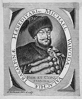 Mihai, who was also recognized as a Cup-bearer, stated a claim to his share of the Coiani inheritance, demanding in particular 4,000 Goldgulden pledged by the Empire to his maternal grandmother, Elena Șerban.[162] He was still attached to Vienna, with Ferdinand III forcefully keeping him on his entourage and considering him for the throne of Transylvania.[163] In 1643, he was trying to instigate a pro-Habsburg rebellion among the Romanians of Transylvania.[164] This prevented Prince Matei, whose sons Matei II and Mateiaș had both died, from adopting Michael the Great's grandson.[165] In 1654, formally released from Austrian service, Mihai made a final effort to regain Wallachia, counting on assistance from the Cossack rebels. He fell ill with the plague upon reaching Bohdan Khmelnytsky's court in Chyhyryn, and was recorded as dead by 1656.[166] One tradition suggests that he was the suitor for Domnița Ruxandra, daughter of Moldavian Prince Vasile Lupu and widow of Tymofiy Khmelnytsky.[167] Some scholars also argue that he is the Michael Vaivoda depicted in a 1651 engraving by Elias Wiedemann.[168]