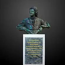 In 1886, a bronze bust by Jean-Baptiste Hugues (1849-1930) was installed on Esplanade de la Tourette. It was moved behind Vieux-Port at rue de la Loge in 1936, moved again after the Second World War to place Fontaine Rouvier, and then to île de Ratonneau, in the yard of Hôpital Caroline which used to host quarantined travellers. In March 2017, the bust was restored to its original setting on Esplanade de la Tourette.[2]