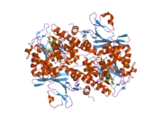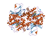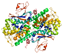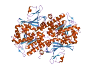 eNAMPT/PBEF/visfatin was originally cloned as a putative cytokine shown to enhance the maturation of B cell precursors in the presence of Interleukin-7 (IL-7) and stem cell factor, it was therefore named "pre-B cell colony-enhancing factor" (PBEF).[6] When the gene encoding the bacterial nicotinamide phosphoribosyltransferase (nadV) was first isolated in Haemophilus ducreyi, it was found to exhibit significant homology to the mammalian PBEF gene.[18] Rongvaux et al.[19] demonstrated genetically that the mouse PBEF gene conferred Nampt enzymatic activity and NAD-independent growth to bacteria lacking nadV. Revollo et al.[20] determined biochemically that the mouse PBEF gene product encodes an eNAMPT enzyme, capable of modulating intracellular NAD levels. Others have since confirmed these findings.[21] More recently, several groups have reported the crystal structure of Nampt/PBEF/visfatin and they all show that this protein is a dimeric type II phosphoribosyltransferase enzyme involved in NAD biosynthesis.[22][23][24]