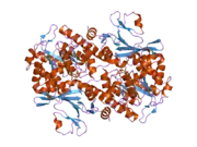 Nicotinamide phosphoribosyltransferase (NAmPRTase or NAMPT), formerly known as pre-B-cell colony-enhancing factor 1 (PBEF1) or visfatin for its extracellular form (eNAMPT),[5] is an enzyme that in humans is encoded by the NAMPT gene.[6] The intracellular form of this protein (iNAMPT) is the rate-limiting enzyme in the nicotinamide adenine dinucleotide (NAD+) salvage pathway that converts nicotinamide to nicotinamide mononucleotide (NMN) which is responsible for most of the NAD+ formation in mammals.[7] iNAMPT can also catalyze the synthesis of NMN from phosphoribosyl pyrophosphate (PRPP) when ATP is present.[8] eNAMPT has been reported to be a cytokine (PBEF) that activates TLR4,[9] that promotes B cell maturation, and that inhibits neutrophil apoptosis.