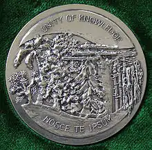 The medal is made by Danish sculptor Rikke Raben for the Niels Bohr Institute. On the front is a portrait of Niels Bohr, the atom sign and stars. The illustration on the back is inspired by a quote from Bohr: What is it that we human beings ultimately depend on? We depend on our words. We are suspended in language. Our task is to communicate experience and ideas to others.[21] On the back of the medal: Unity of Knowledge – the title of a lecture given by Bohr at Columbia University in 1954. Nosce te ipsum is Latin and means "know thyself". This quote originates from the Oracle of Delphi, in the Temple of Apollo in Greece.