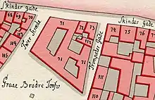 The short section from Valkendorfsgade to Gråbrødretorv (Løvgade) was called Tugthusporten (Jailhouse Gate) after a children's jail established at the site by Christian IV but soon moved to Christianshavn (see Women's Prison, Christianshavn).[2] It was a narrow, vaulted passageway which ran through a building. The building had six window bays along the square and two window bays across the street.[3]