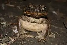 Two frog species are classified as endangered on the EPBC Act. One is the Fleay's barred frog (Mixophyes fleayi), a large frog of 90mm that relies on small streams in rainforest habitat.[24] The other is the giant barred frog (Mixophyes iteratus), a large frog up to 108mm with a powerful build.[25] There is an endangered species listed under the TSC Act called Loveridge's frog (Philoria loveridgei), a small ground-dwelling frog of 30mm in size. The pouched frog (Assa darlingtoni) and green-thighed frog (Litoria brevipalmata) are both listed as vulnerable under the TSC Act. All of these frogs are mainly threatened by the chytrid fungus.