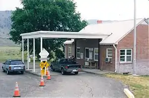 A customs office existed at Chopaka during the summer of 1861, before relocating to Osoyoos.[2] The next office opened in 1907 for railway traffic but relocated to the Keremeos preventative station the following year. That office closed in 1917 but reopened in 1940.[3] During the earlier years, a Keremeos officer would travel to Chopka to clear any livestock movements across the border.[4] The Similkameen office opened on the rail line a short distance north of the border in 1917 but closed in 1940.[2] In 1959, the Chopaka station was reopened at the road crossing, which is about 4 kilometres (2 mi) east of the rail crossing.[5] This road crossing existed by at least the mid-1950s.[6]