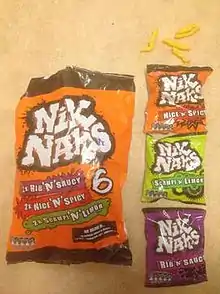 Nik Naks are a type of extruded corn snack previously manufactured by Sooner Snacks in the United Kingdom. The snack was introduced as Crunchy Wotsits, with a cheese flavour, in 1981. The brand was purchased by Golden Wonder in 1987 and then sold to United Biscuits in 2006. In December 2012, United Biscuits agreed to sell the KP Snacks brand, including Nik Naks, to the European Intersnack Group.[1] As of 2021, Nik Naks are made in three flavours (all of the format "X 'n' Y") with different colour packaging for each.