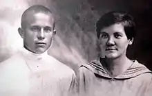 When World War I broke out in 1914, Khrushchev was exempt from conscription because he was a skilled metal worker. He was employed by a workshop that serviced ten mines, and he was involved in several strikes that demanded higher pay, better working conditions, and an end to the war.[15] In 1914, he married Yefrosinia Pisareva, daughter of the lift operator at the Rutchenkovo mine. In 1915, they had a daughter, Yulia, and in 1917, a son, Leonid.[16]