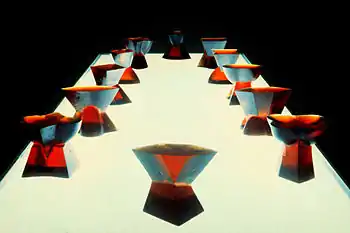 Nikola Pešić's art consists of highly esthetic objects which hide and generate at the same time different meanings by means of their simple pleasing forms and lines. The interpretation of Pešić's art is based on symbolic models of Christianity, gnosticism and non-Christian religions. According to Nikola, art must be attractive "at first sight". His sculptures are made of transparent and dim polyesters, epoxy and acrylic resins, magnifying glasses, mirrors, brass and other polished and reflecting materials. Even though Pesic tries to achieve perfection, he rarely uses machines when manufacturing his sculptures, and he usually does everything manually. As he himself says: "My sculptures should reflect my wish to make something perfect, and at the same time the impossibility to do it. I think that the manually shaped forms have special enchant and power.[6]