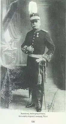 During the 1897 war he was a captain, and distinguished himself through his bravery in the Battle of Velestino, earning a field promotion.[2] On the outbreak of the First Balkan War, he commanded the 7th Infantry Regiment within the Army of Thessaly. Following the capture of Thessaloniki, he led a mixed force of two battalions and an irregular volunteer corps to the capture of the island of Chios, which he accomplished against strong opposition by the Ottoman garrison. After the capture of Chios, he and his men were transferred to the Epirus sector, where he led one of the attack columns during the capture of Ioannina.[2] He subsequently served as CO of the 8th Infantry Division and then of the 6th Infantry Division, which he led during the Second Balkan War. He retired on 16 December 1916 with the rank of lieutenant general.[2]